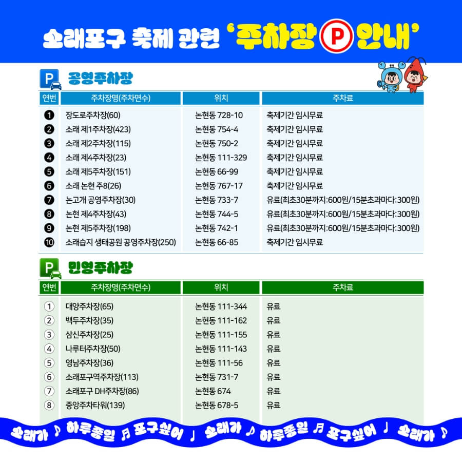 - 민간주차장 역시 축제기간동안은 혼잡이 예상되며, 요금 및 기타사항은 별도로 확인부탁드립니다.