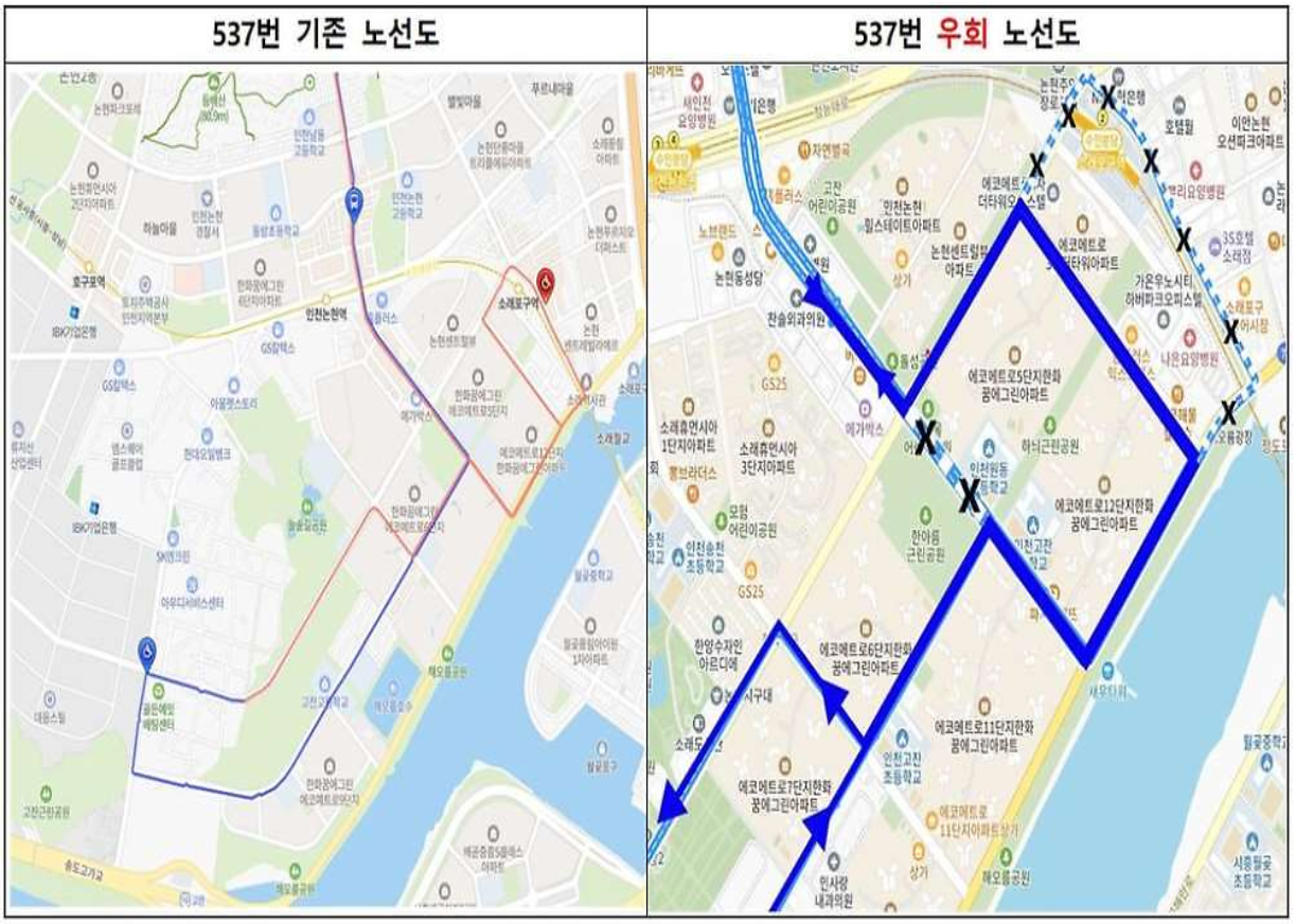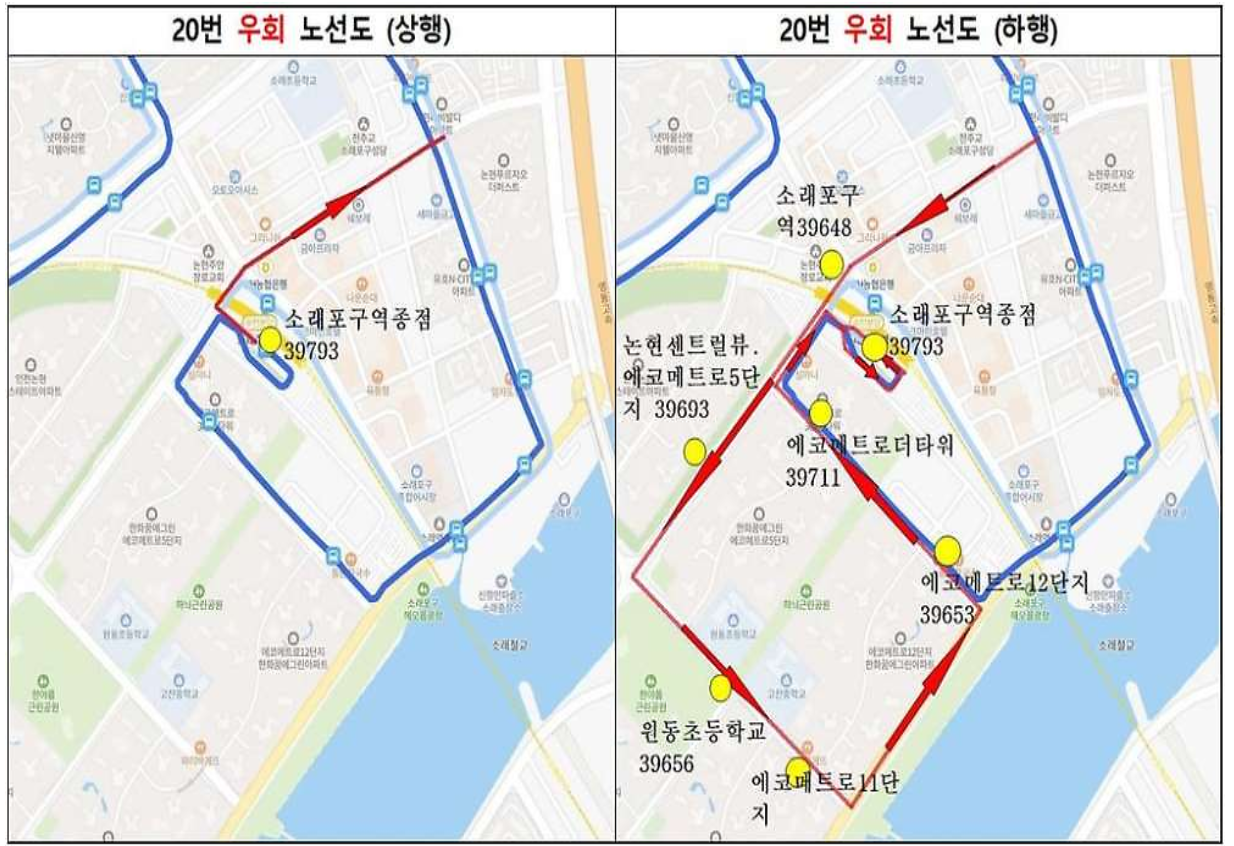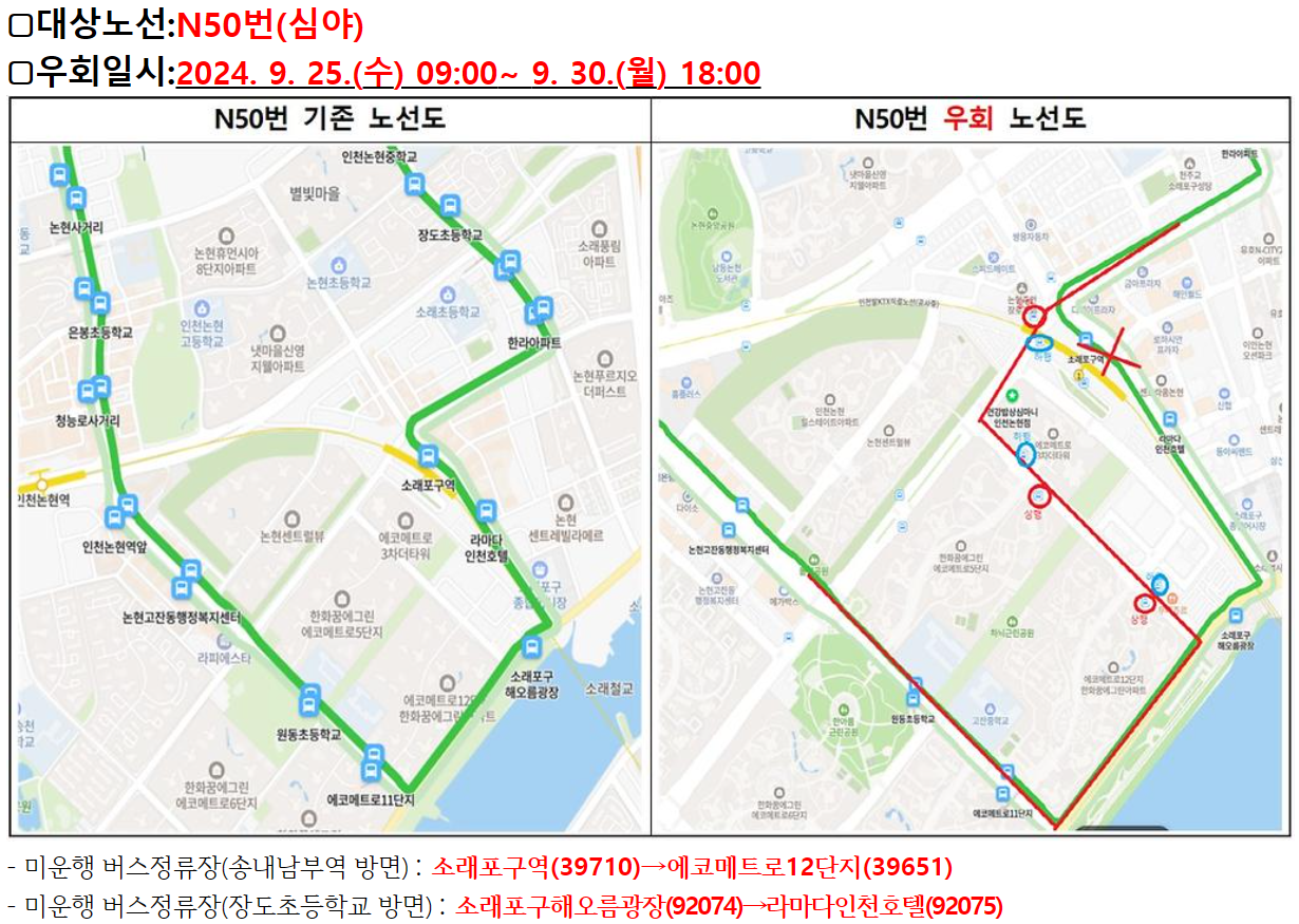 시내버스 노선 임시우회 운행 안내문 [20번, 순환52번, 537번, N50번(심야)]