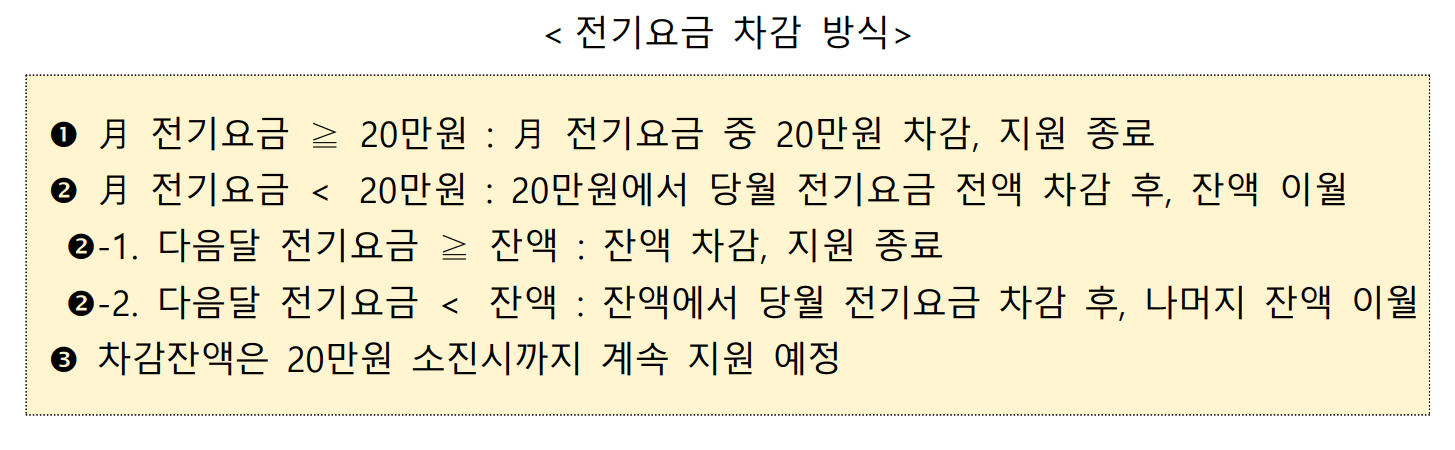 | 지원방식 | 대상자 통보 후 최초 발행되는 전기요금 고지서상청구되는 전기요금부터 최대 20만원 차감 |